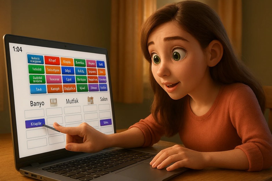 Merhaba! Burada senin için bir kelime oyunu var. Evimiz bugün biraz dağınık. Eşyalar her yerde. Banyo, mutfak ve salon var. Eşyaları sürüklüyorsun ve doğru odaya bırakıyorsun. Hadi bakalım!