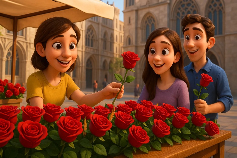 Sokaklar renkli tezgahlarla dolu oluyor. Satıcılar bu tezgahlarda kitaplar ve kırmızı güller satıyor. Kitapçılar La Rambla ve Passeig de Gràcia gibi ünlü caddelerde renkli stantlar açıyor. İnsanlar romanlar ve çocuk kitapları arıyor. Aileler tapas ve sandviç alıyor. Kafe terasları dolu oluyor. İnsanlar kafe terasında kahve içiyor. Piknik yapan aileler parkta keyif yapıyor. Çocuklar hikayeler okuyor. Gül kokusu sokakları kaplıyor. Hatıra fotoğrafları çekiliyor.